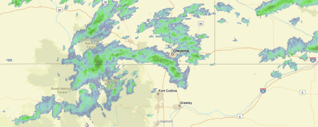 Count me in the “not likely” camp on Sunday thunderstorms. Everything right now just looks like it will show up too far to the south. Not today though, here is radar imagery, with showers heading in from Wyoming.