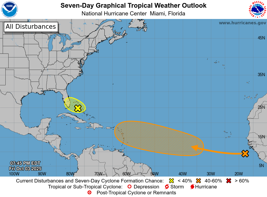 7:05PM: I’m not saying to panic, but I am saying to watch this orange area. The long term track keeps pulling it further eastward (away from the US), but still, keep vigilant.