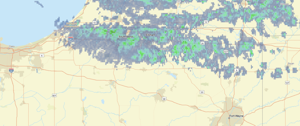 I’m not sure why so many of my compatriots are calling for rain in Elkhart. I would be surprised if it lasts the day, let alone the week. Here, take a look.