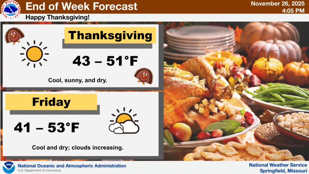 4:26PM: Thanksgiving is tomorrow! I hope you aren’t just learning that from me. The country mostly looks like it will in Springfield, Missouri. Mostly clear, and with the first dose of chilly air for the season. It will continue snowing in the Great Lakes, and be warm out west, but it’s a big country and this is only one blog. Happy Thanksgiving!