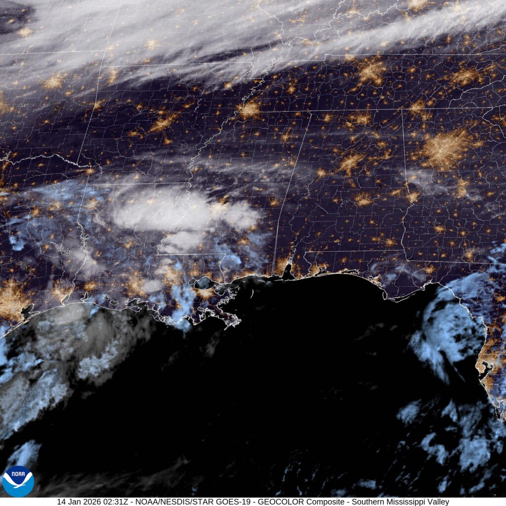 This is a day that isn’t particularly chilly for the part of the country I’m in, but in Alabama, this is a winter parka scenario. Take a look at the satellite, with the cold front to the north, and moisture arising from the south.