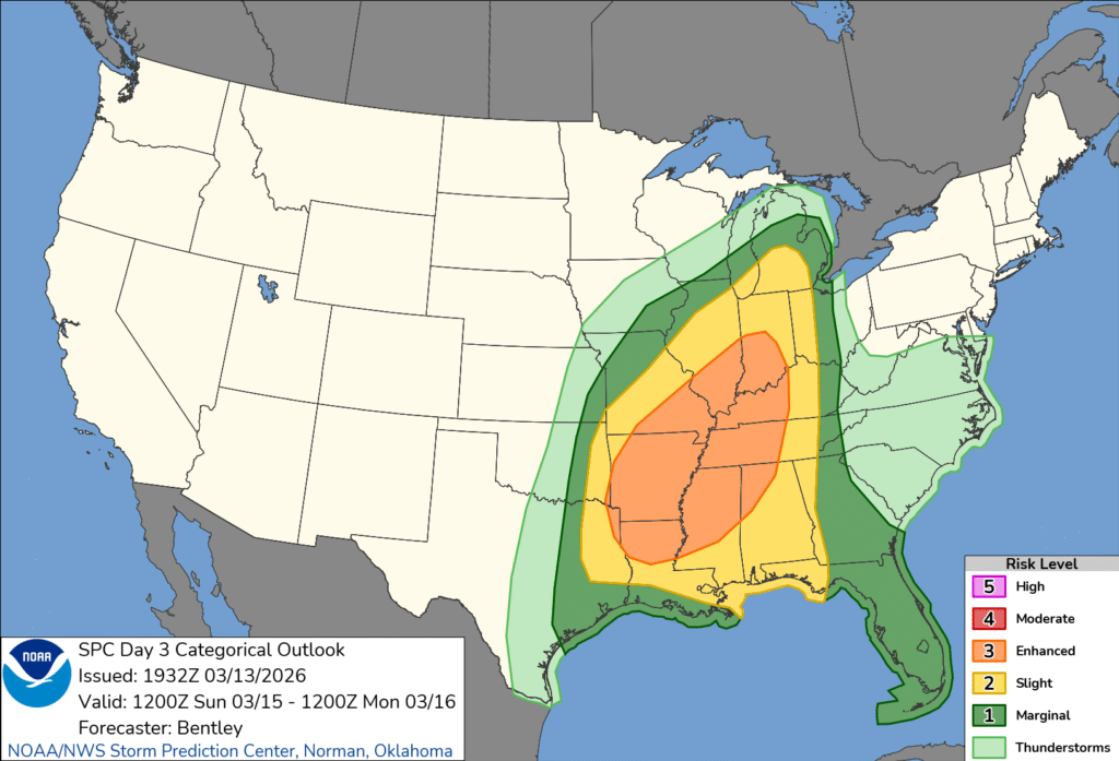 10:15PM: Here in Minnesota, we’re worried primarily about the overwhelming amount of snow and ice that is coming our way. As I noted, however, we’ve got a jump on the severe weather season as well for many parts of the country. The more traditional March storm zone will get it on Sunday. It will be a good day to remain vigilant in the Mississippi Valley, east to the Tennessee Valley.
