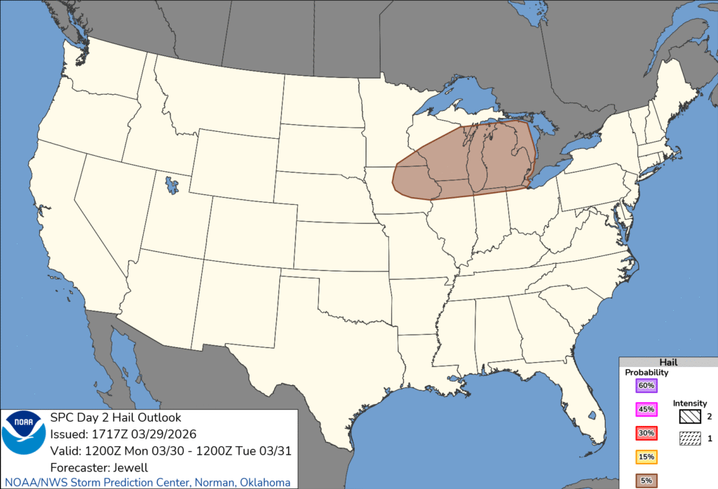 Take a look at the hail forecast from the SPC, issued for Monday. There is a swath of the Great Lakes that will see a threat for hail tomorrow.