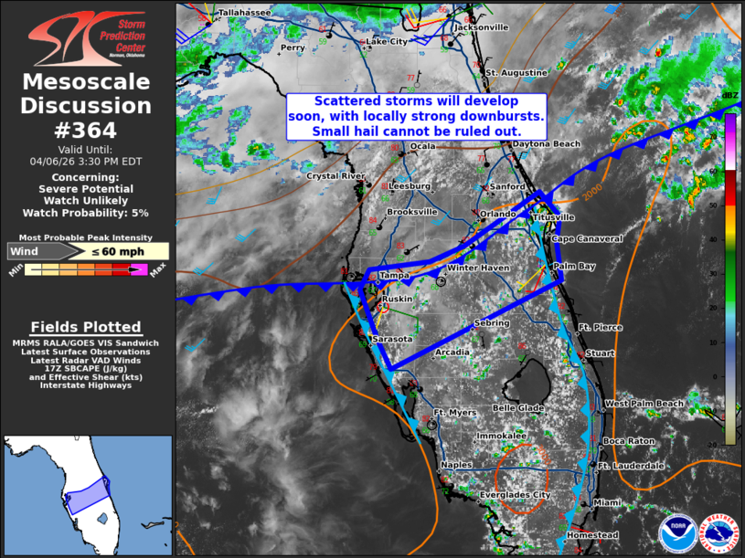 1:50PM: The map is pretty quiet today. The closest thing to action is this area, being watched by the SPC in Florida. The area could use the rain, so as long as the activity isn’t severe, this might qualify as good news.